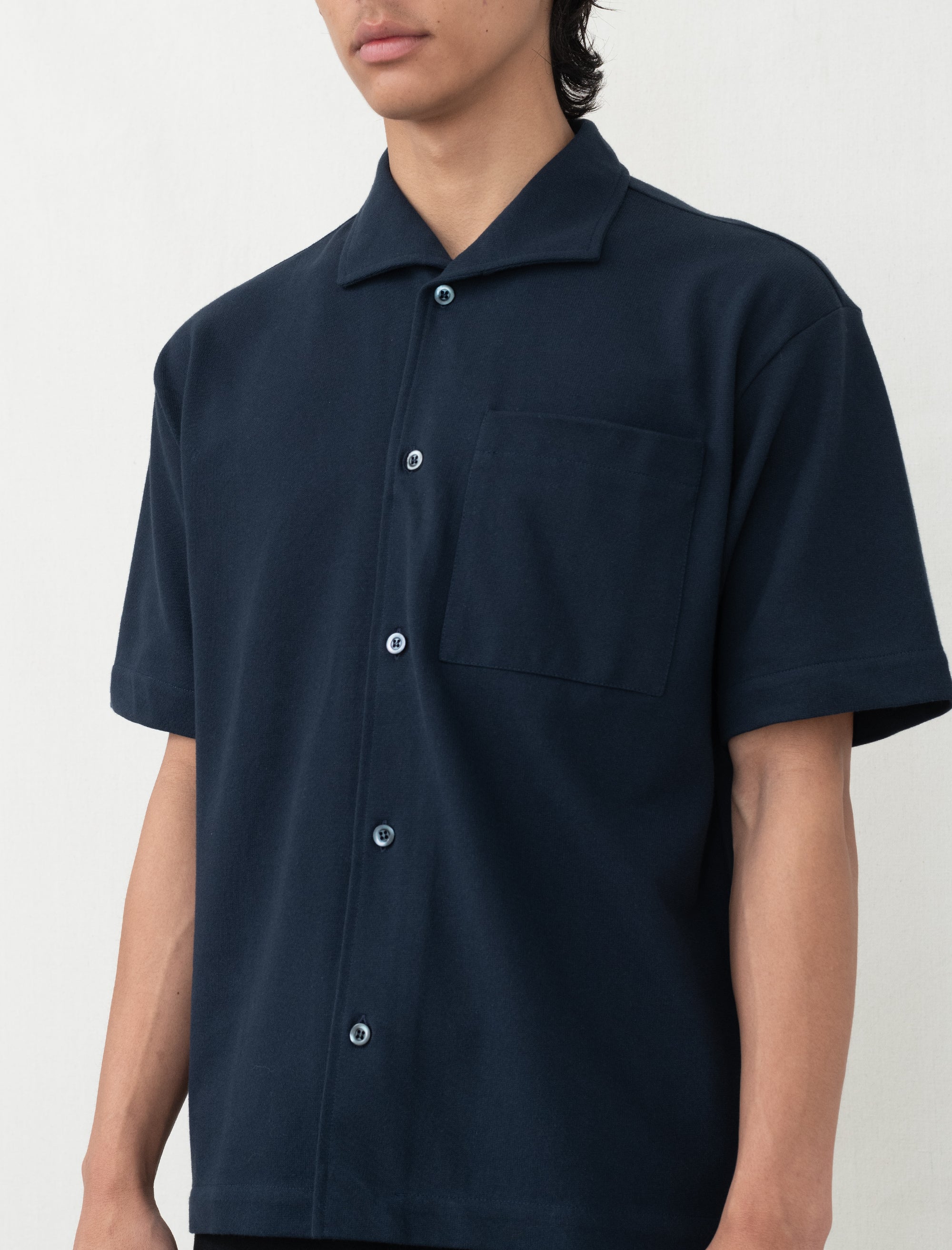 The Rachel Mesh CORAL is a short sleeve nautical-style shirt with a boxy fit, made from heavyweight traditional Rachel fabric. The 100% combed cotton mesh is knitted specifically for Arpenteur on old Rachel looms, based on classic French Navy uniform material but updated with a softer hand and improved durability. The open knit structure provides breathability despite its substantial weight. The shirt features a naval neckline, mother of pearl buttons, one chest pocket, and is runproof and durable. It is knitted and manufactured in France.