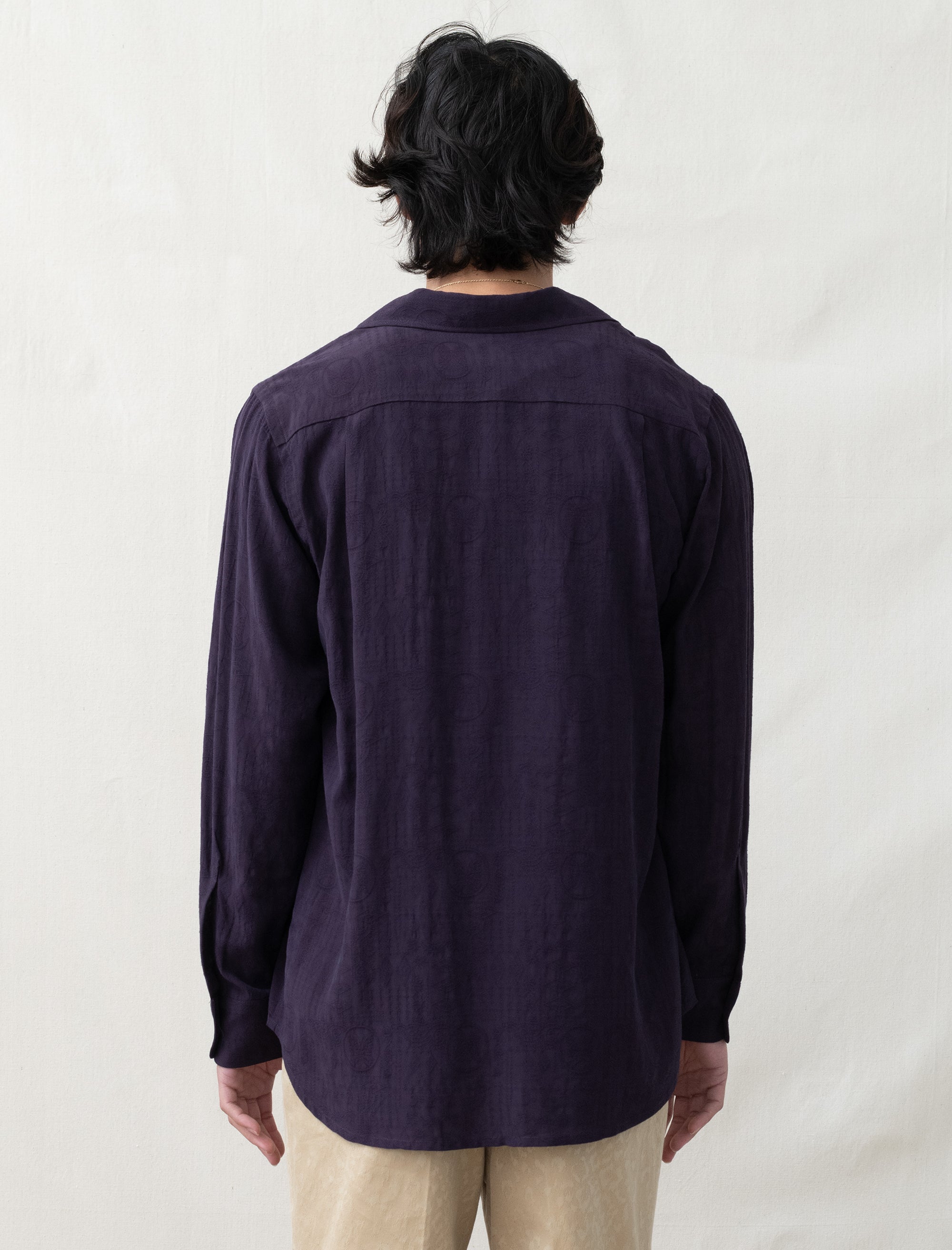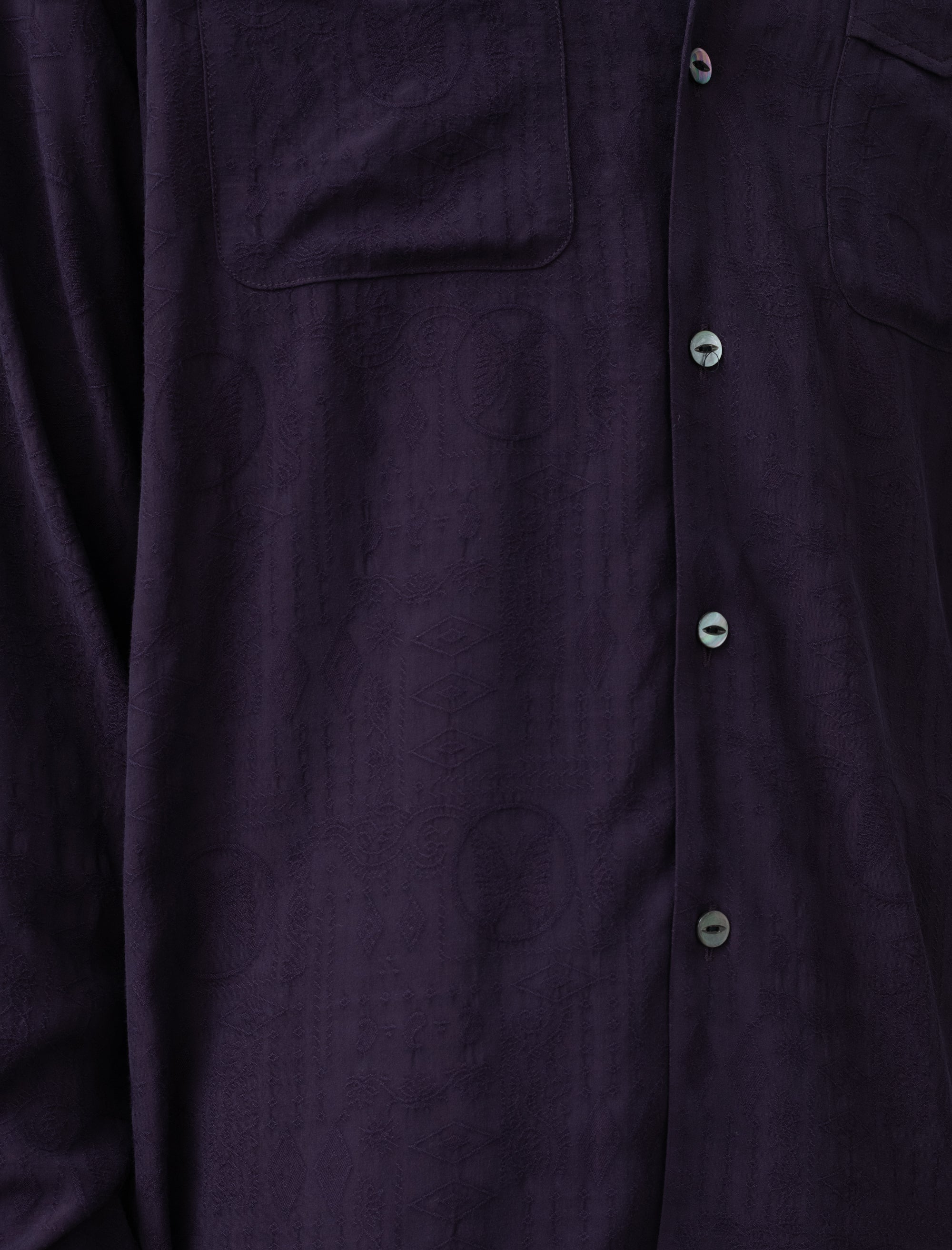 The One-Up Shirt is made in Japan from a rayon fabric with an allover jacquard butterfly pattern. It features an open spread collar with button fastening, button front closure, chest patch pockets, and buttoned vented cuffs. Color: Purple. Material: 100% rayon.