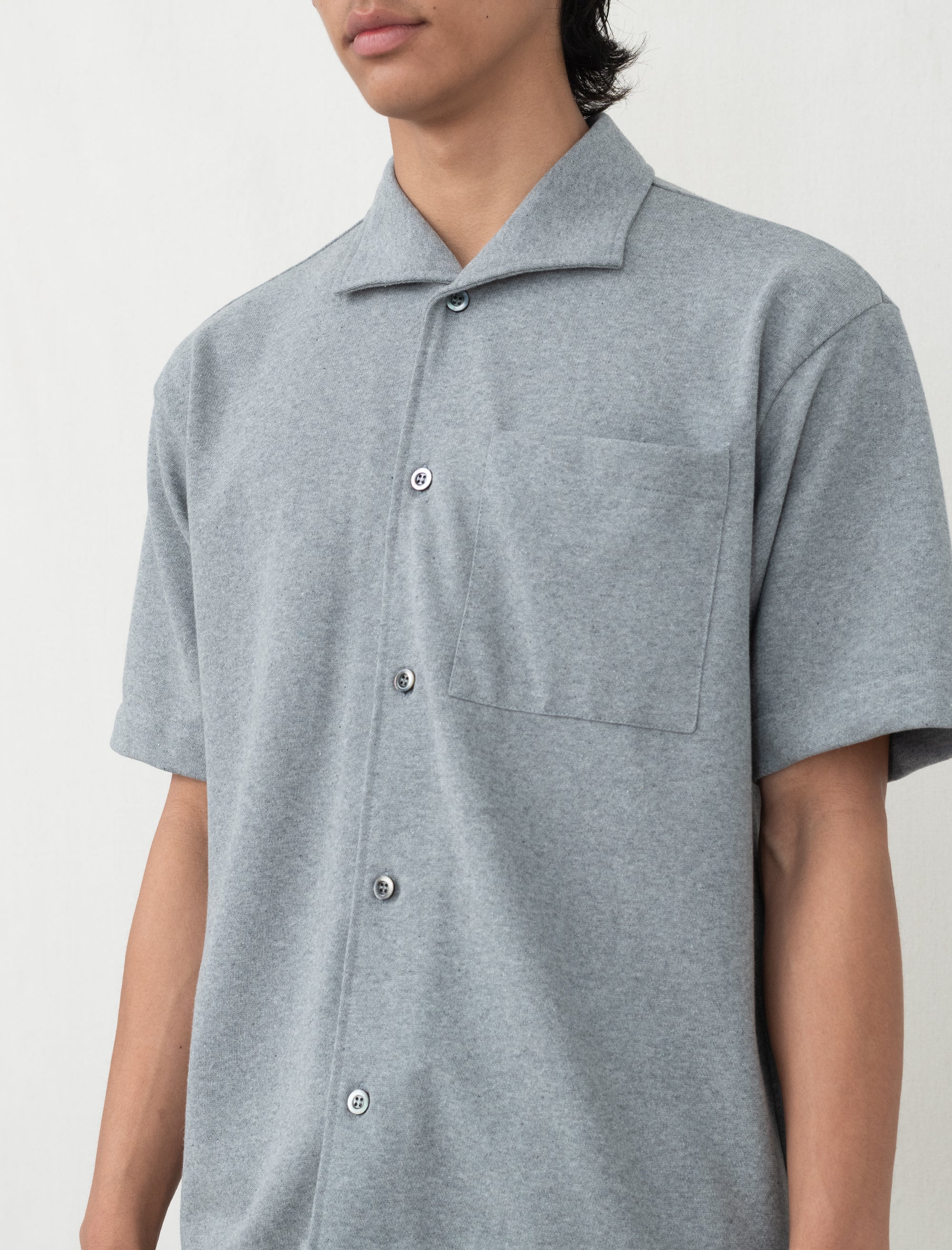The Rachel Mesh CORAL is a short sleeve nautical-style shirt with a boxy fit, made from heavyweight traditional Rachel fabric. The 100% combed cotton mesh is knitted specifically for Arpenteur on old Rachel looms, based on classic French Navy uniform material but updated with a softer hand and improved durability. The open knit structure provides breathability despite its substantial weight. The shirt features a naval neckline, mother-of-pearl buttons, one chest pocket, and is runproof and durable. It is knitted and manufactured in France.