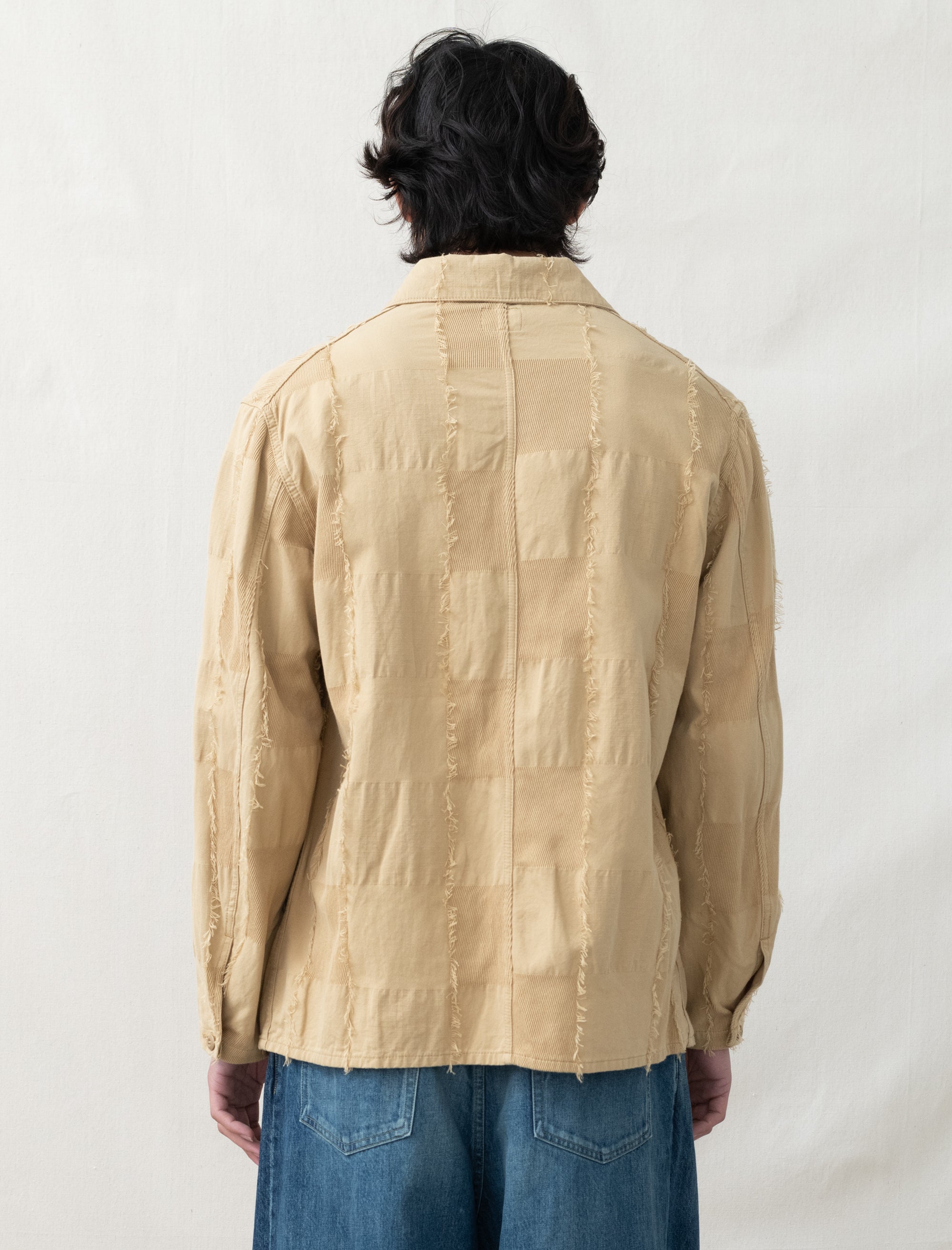 The Needles Coverall Jacket is made from cotton ripstop and cotton twill with a paneled construction and frayed edges throughout. It features a spread collar, button closure, patch pockets, adjustable button cuffs, and a central back seam. The jacket is unlined and is made in Japan.