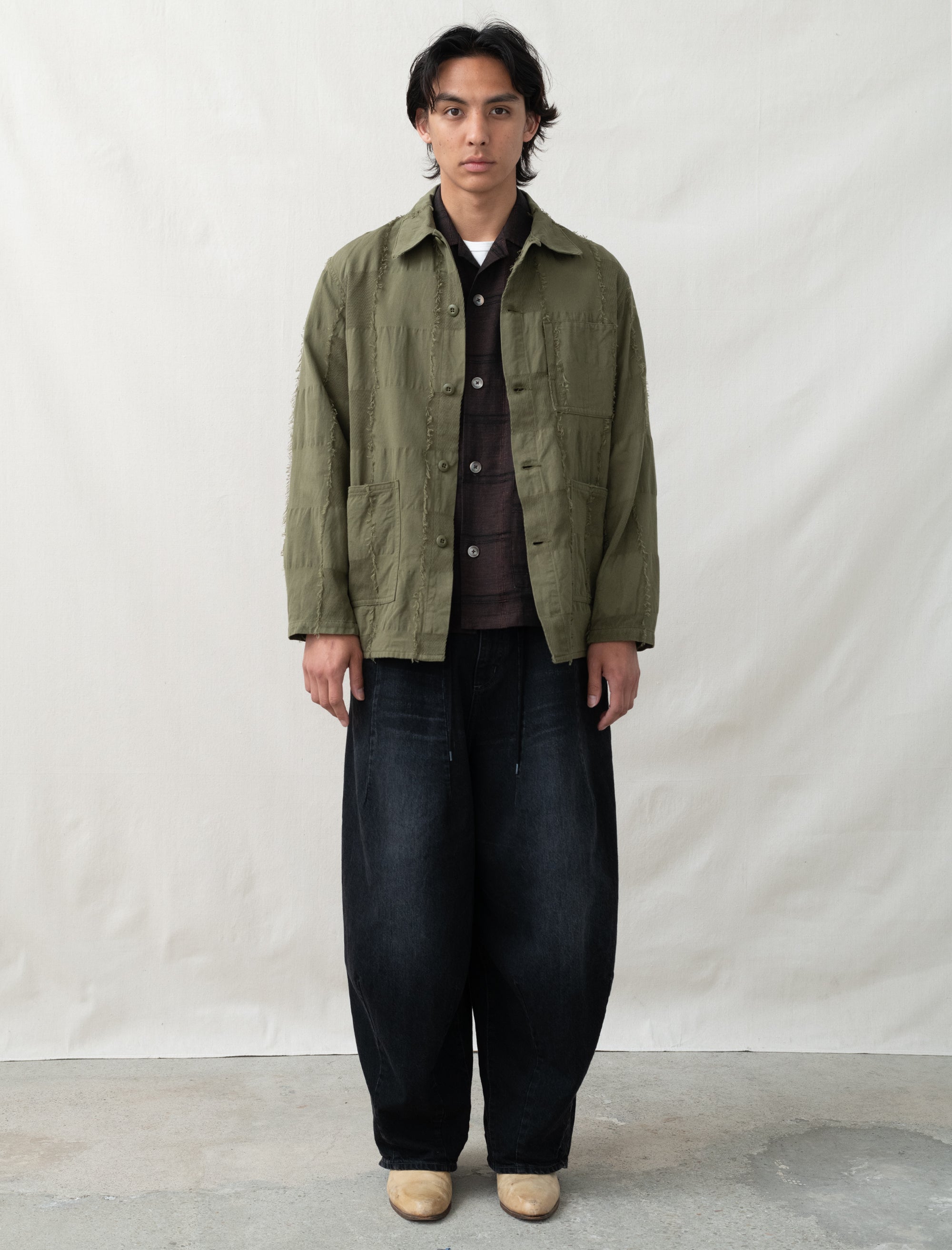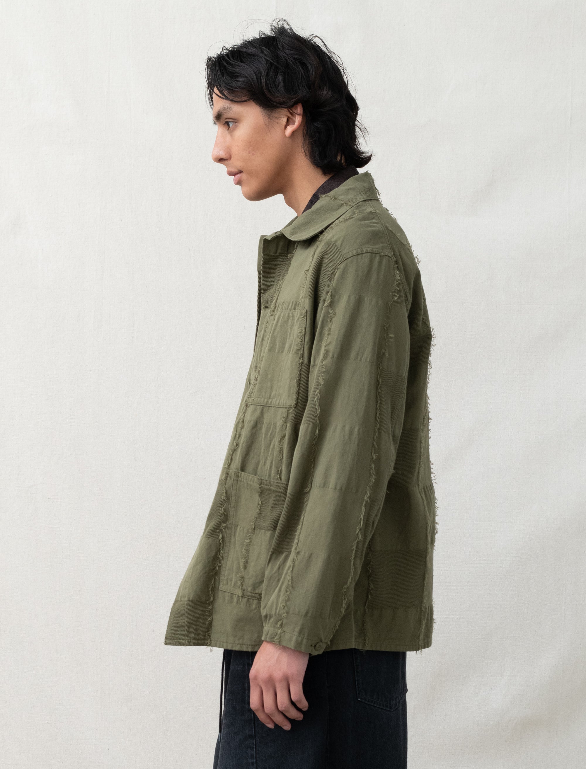 The Needles Coverall Jacket is made from cotton ripstop and cotton twill with a paneled construction and frayed edges throughout. It features a spread collar, button closure, patch pockets, adjustable button cuffs, and a central back seam. The jacket is unlined and is made in Japan.