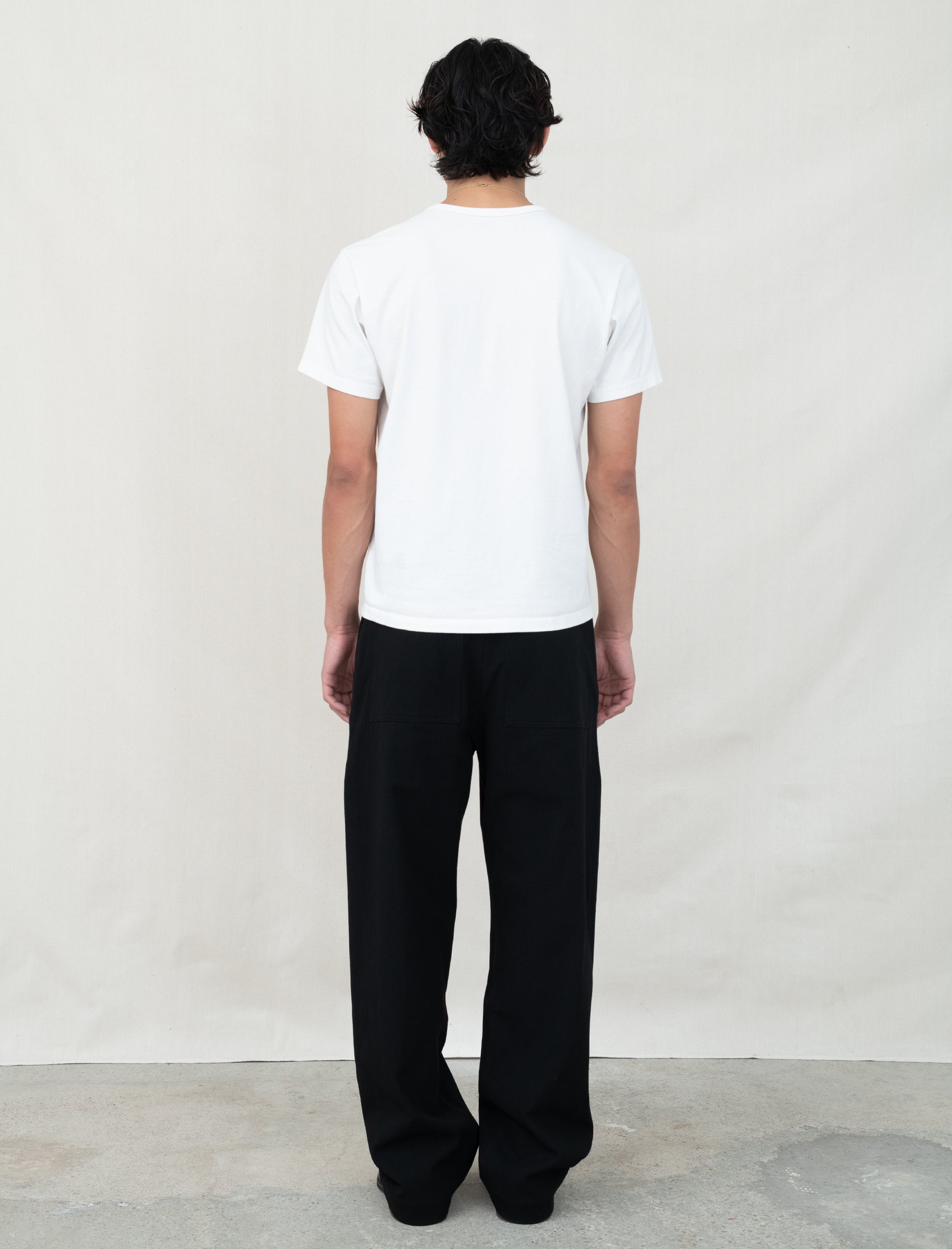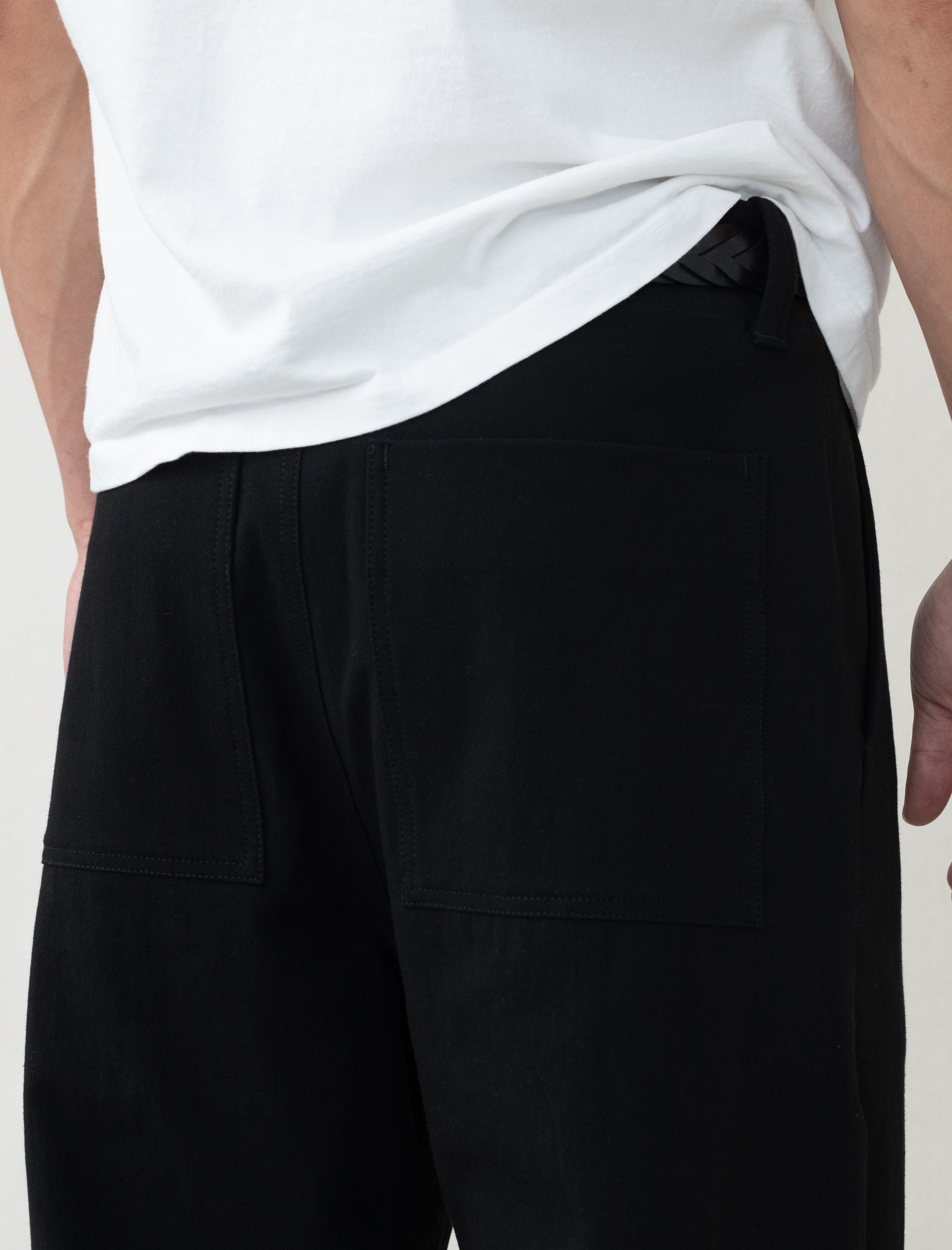 Arpenteur Lux Pant. Wide fit, slub cotton oxford pant. Details include french bearer buttons and zip closure, two slant side pockets, two back patch pockets, and no side seam. Made in France.