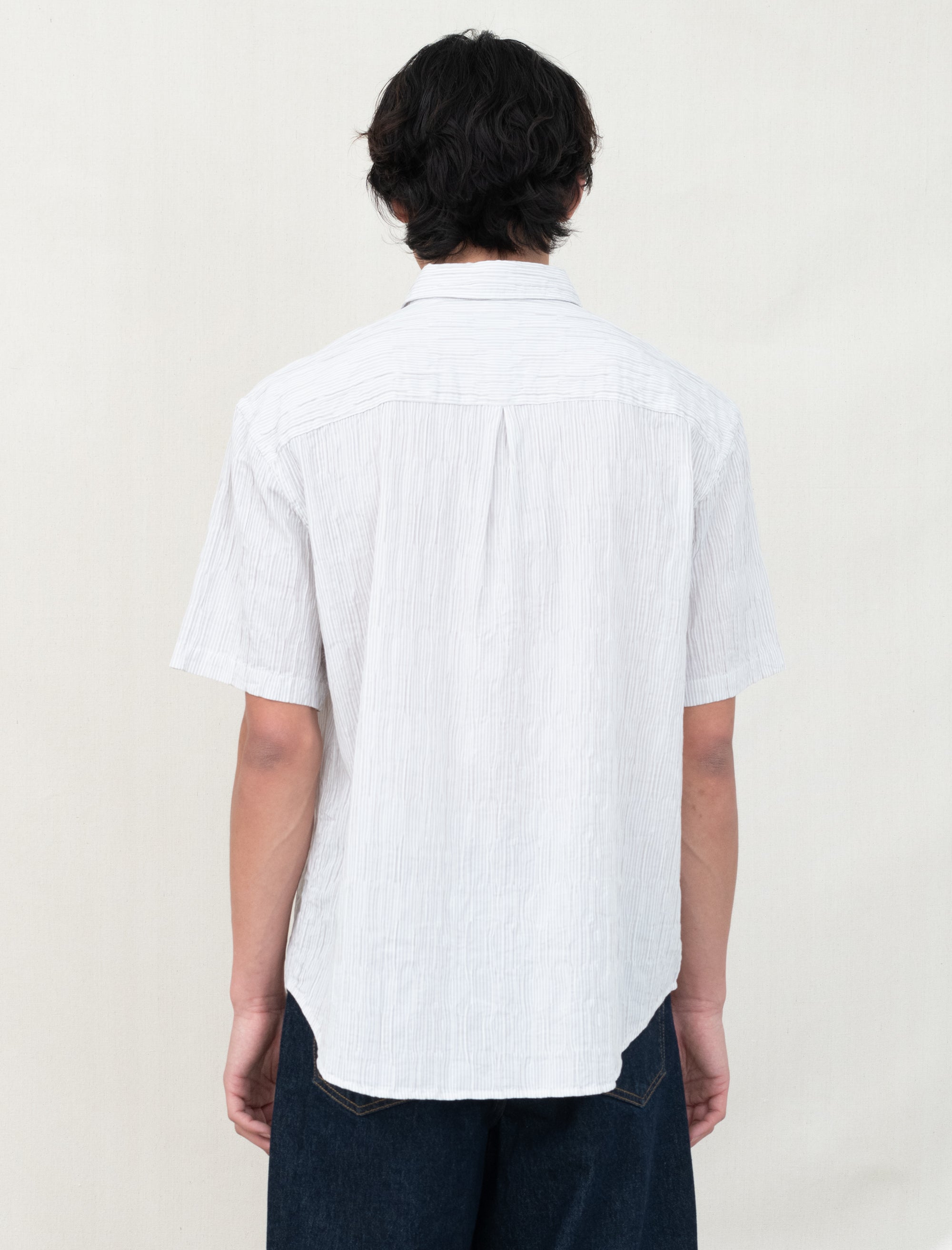 Stüssy Wavy Striped Shirt. Boxy fit lightweight shirt in a wavy-textured washed cotton blend. Features a ring snap closure, patch pocket and curved hem. Stüssy swirly "S" embroidery below the pocket.